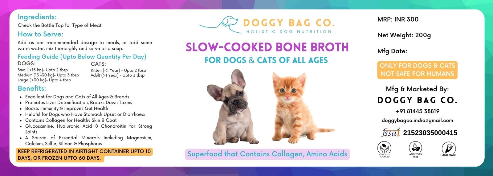 Doggy Bag Co’s Slow-Cooked Bone Broth, available in chicken, fish, mutton, pork, and buff, offers a rich, nutritious boost for your pet’s meals. Broths are a great way to start feeding natural to both cats & dogs. Even the fussy ones appreciate a bowl of slow-cooked broths!